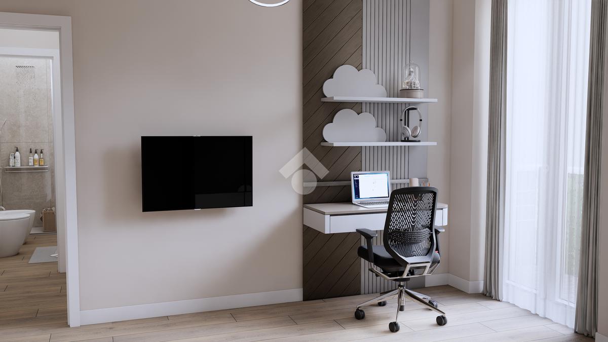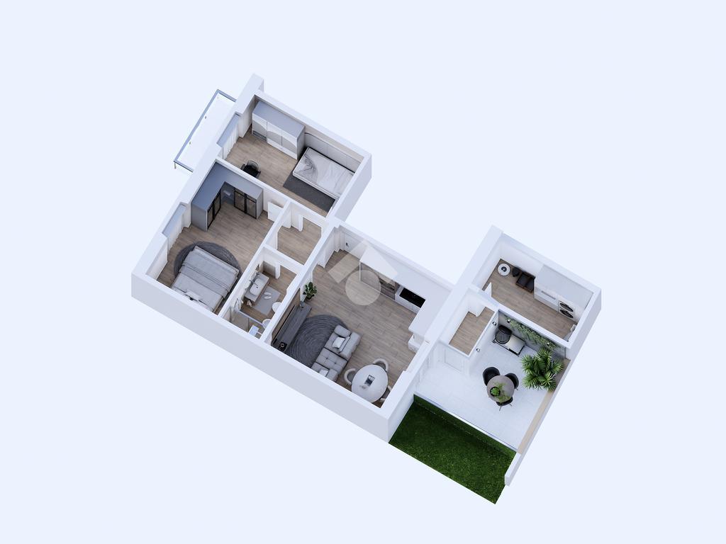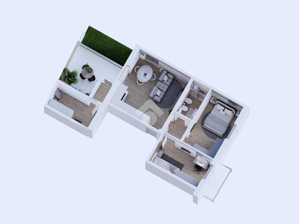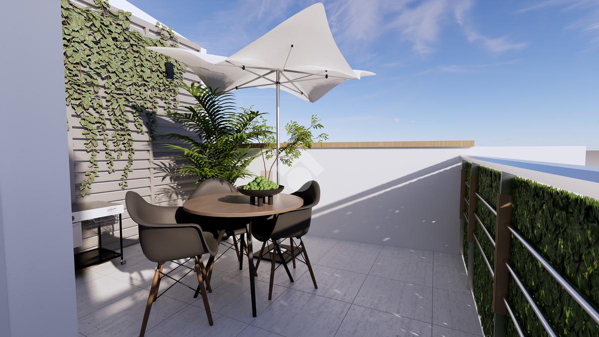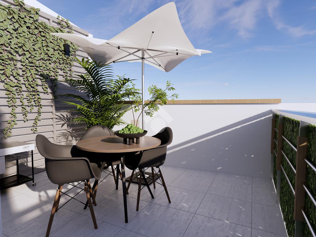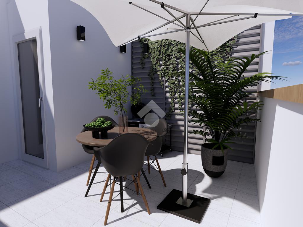 La zona giorno si apre su un luminoso open space con angolo cottura, dal quale si accede a uno spazio esterno abitabile, ideale per momenti di relax o convivialità all’aperto.