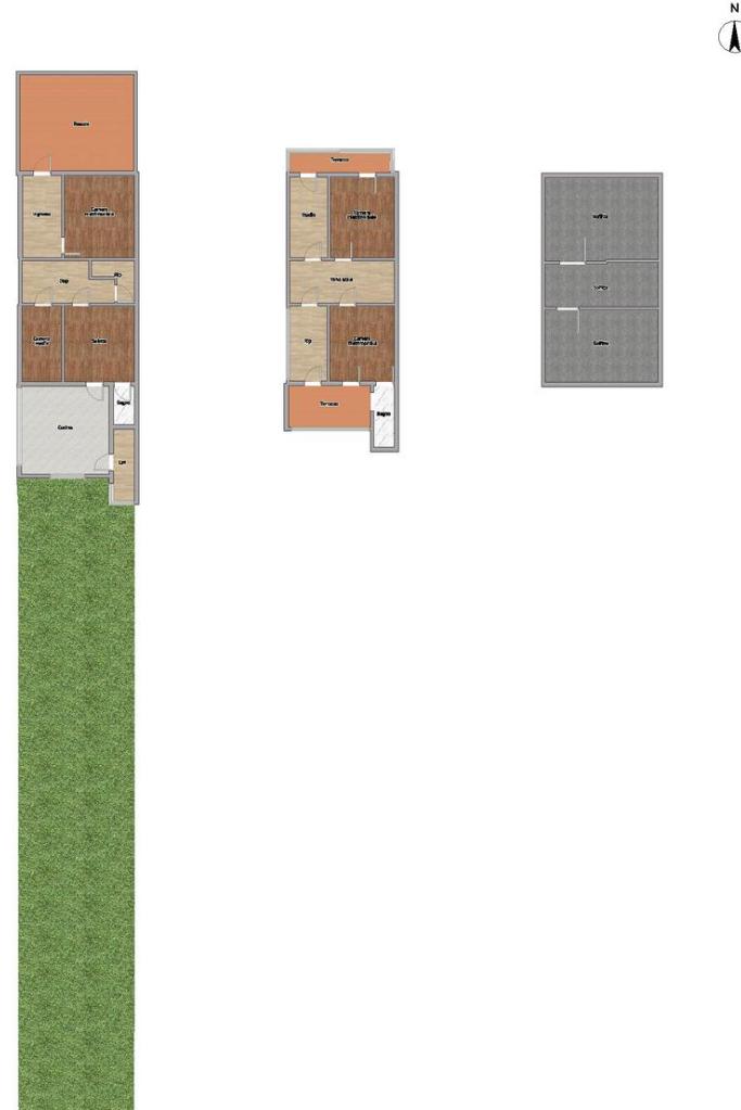 Al piano terra troviamo la zona giorno composta da un ampio e luminoso soggiorno, una cucina abitabile con accesso diretto all’esterno, un bagno finestrato con doccia e due camere da letto, di cui una matrimoniale e una media.